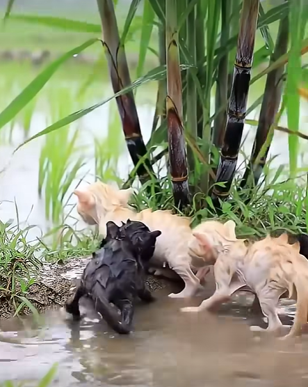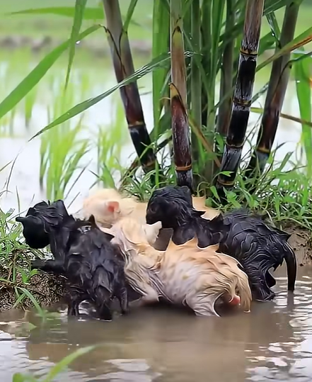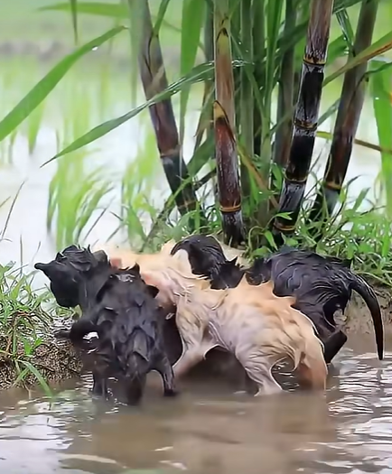 Its soaked fur and wide eyes tell the story of fear, but also of survival. At this moment, the chance of safety finally arrives.