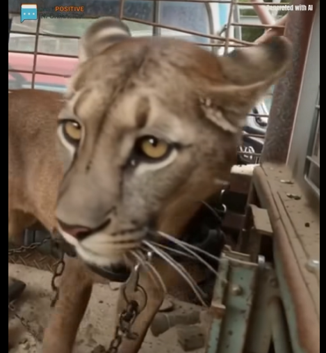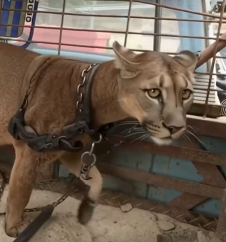 The images show a wildcat, likely a puma, restrained by heavy chains and harnesses inside a makeshift cage.