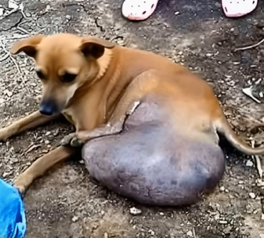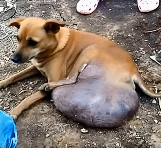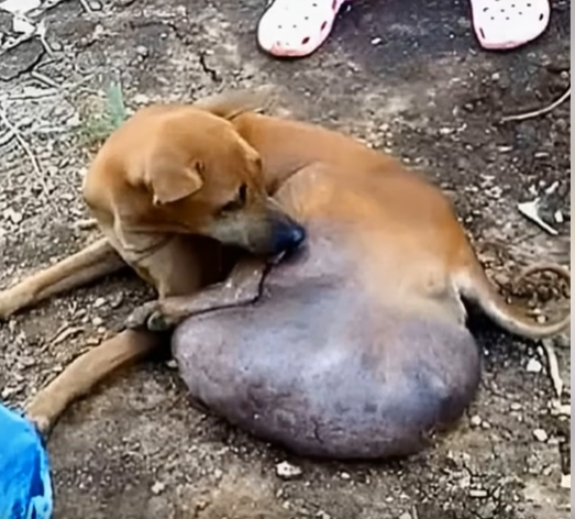 In a heartbreaking scene captured in these images, a stray dog lies on the ground—quiet, alert, and visibly burdened by a massive growth attached to her lower abdomen.