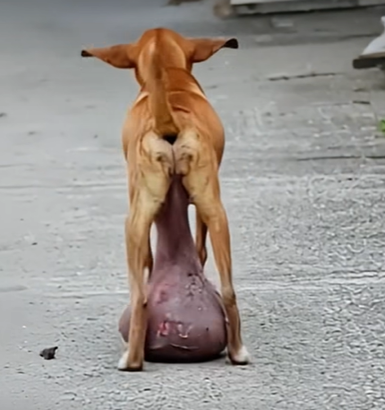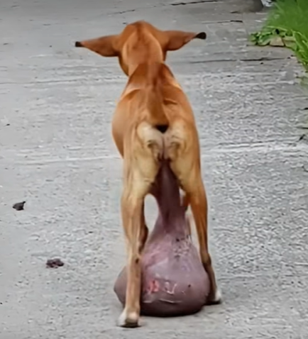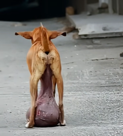 In a heartbreaking scene captured on a quiet roadside, a stray dog is seen dragging an enormous tumor between its hind legs.