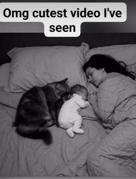 As the baby sleeps peacefully between the mother and the cat, the picture captures something timeless: love, protection, and trust shared across species.