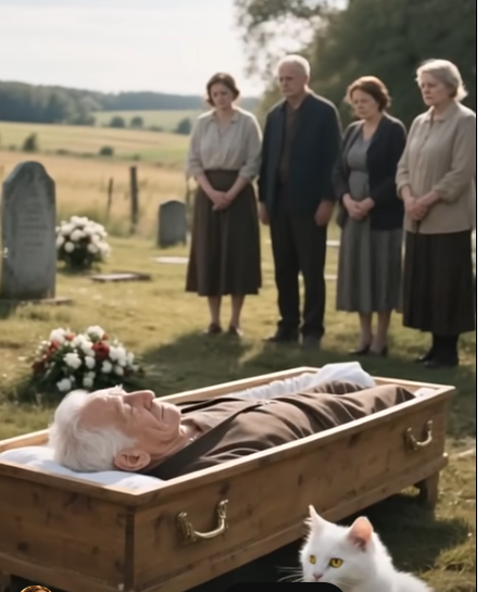 The scene was quiet, the grief palpable, but a soft white cat sat nearby—unmoving, alert, as if it understood more than anyone else what was about to unfold.