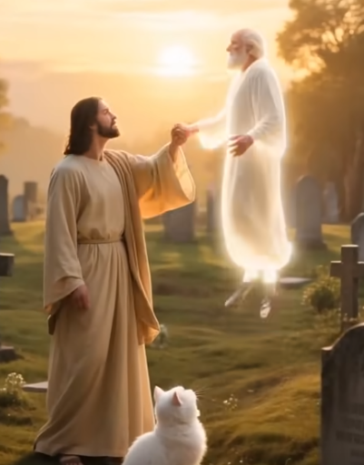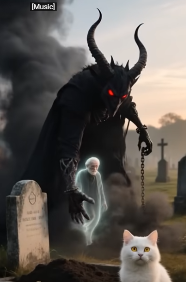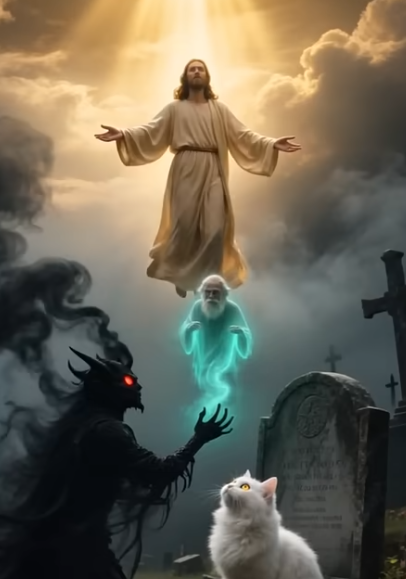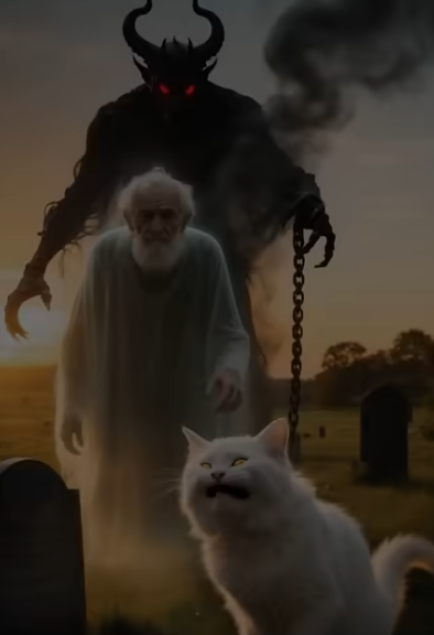 The graveyard was bathed in golden warmth, and the soul, once nearly lost, was now redeemed. The cat watched silently, its purpose fulfilled.