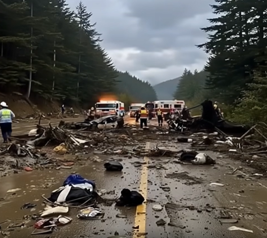 Preliminary reports suggest a high-impact crash involving multiple vehicles—potentially a passenger bus and a transport truck—during heavy rain and limited visibility. The scale of destruction left first responders speechless.