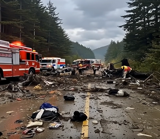 In the early hours of the morning, first responders arrived to a haunting sight—charred debris, torn luggage, and remnants of a vehicle scattered across a remote highway surrounded by dense forest.